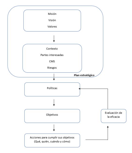 La coherencia y armonía entre políticas y objetivos apuntan hacia la sostenibilidad y mejora continua no solo del sistema de gestión, sino de la empresa. De hecho, los objetivos parten de la política, ella establece el marco de acción. La consecución de esos objetivos es la materialización de la política. Esta idea puede asimilarse con mayor exactitud en el siguiente esquema.